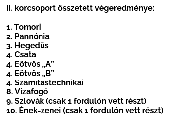 Érdekesen alakultak a dobogóról lemaradó csapatok sorsa. A bajnokság történetében ilyen még nem fordult elő, hogy négy (!) iskola is azonos pontszámmal végzett volna a két forduló után. Idén ez is megtörtént. Végül mind a négy csapat a negyedik helyen zárta a bajnokságot.
